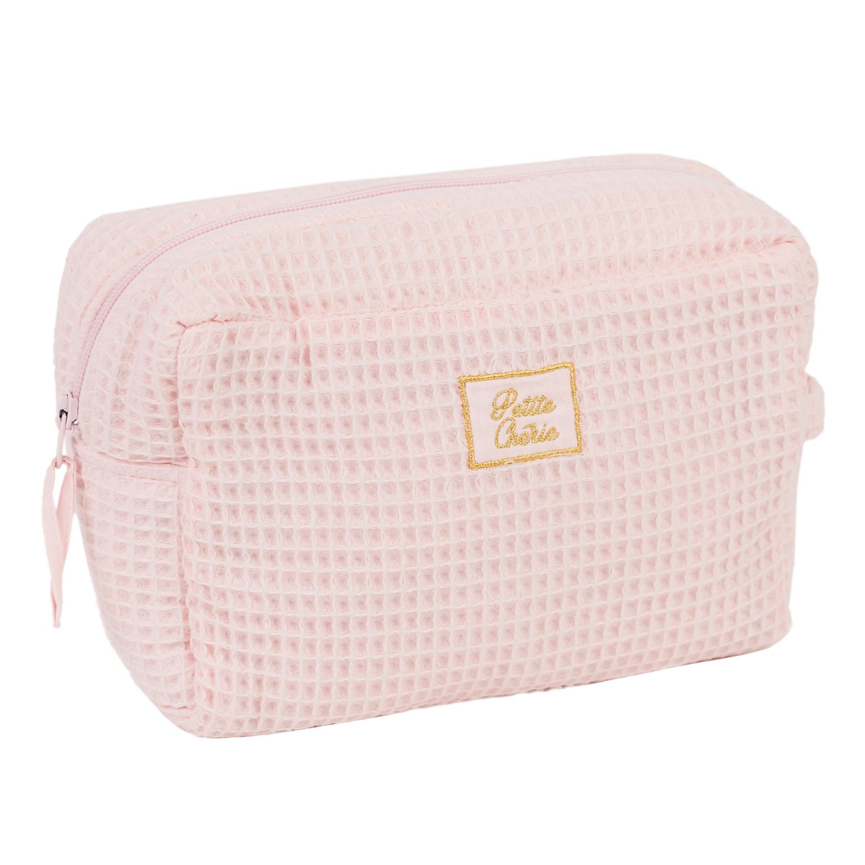 Enfin une trousse de toilette imperméable à la fois jolie et pratique ! Extérieur en nid d’abeille pur coton, doublure en coton enduit et rembourrage en ouate polyester. Patch brodé sur le devant.